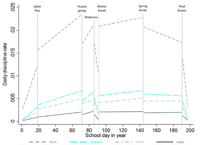 Rates of school discipline fluctuate widely and predictably throughout a school year and increase significantly faster for Black students than for their white counterparts, University of California, Berkeley, researchers have found.