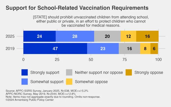 In addition, the percentage of those who “strongly support” school-related vaccination requirements has fallen sharply, from nearly half (47%) of U.S. adults in 2019 to barely a quarter (24%) in January 2025.