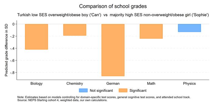 Gender bias was evident in teacher-assigned grades in all subjects except for chemistry. Girls had an advantage in German, math, and biology, while boys benefitted in physics. Higher BMIs were associated with significantly lower grades from teachers in every subject, while students with higher parental SES had higher grades. Minority students received lower grades in all subjects except biology. These disadvantages compounded, meaning that irrespective of true skill and aptitude, a boy with a high BMI from a low-SES, minority background received on average lower grades, than a German-born, low BMI girl from a higher SES.