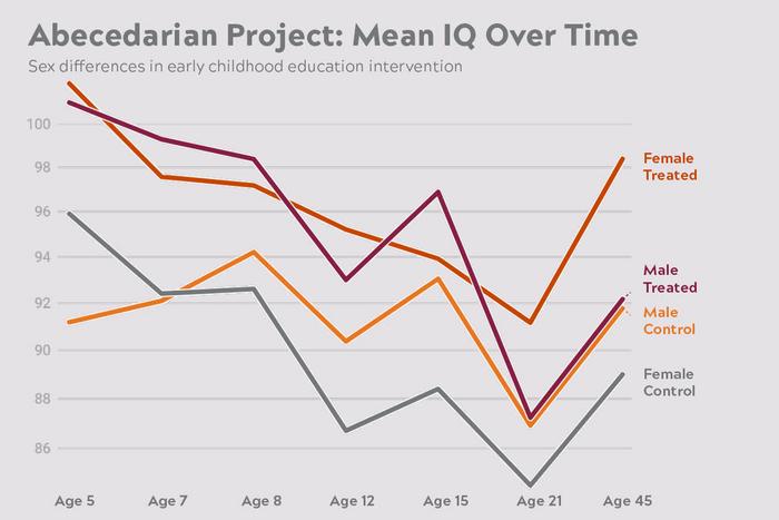 Newly published data from the Abecedarian Project illustrate the long-term effects of early childhood education intervention on IQ scores, showing sex differences across treated and control groups from ages 5 to 45. Male and female treatment effect sizes showed very different patterns of change over time.