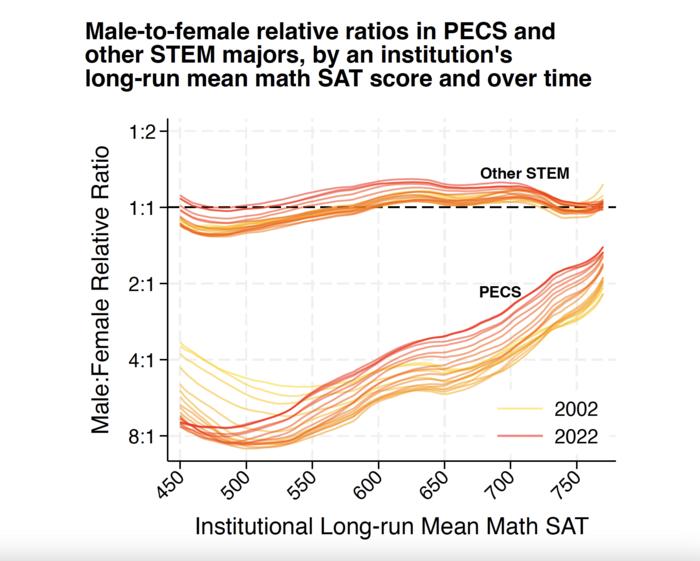 Their results, published in Science, identified average math SAT scores as the most predictive institutional factor of male to female representation in PECS. In 2002, institutions serving students with the highest math SAT scores (around 770 and higher) had 2 men for every 1 woman in PECS fields and narrowed that ratio to 3 men to 2 women in 2022. For schools serving students with much lower SAT scores (around 450), the initial ratio of 3 men to 1 woman in 2002 increased to 7 men for every 1 woman by 2022.